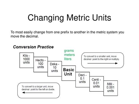 Changing Metric Units. Write the equivalence as a ratio, and multiply it to the given measurement (in metric) to convert. Because the metric system is.